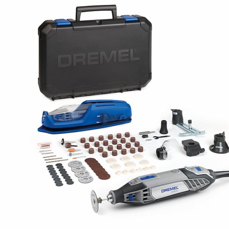 This kit includes the top of the line Dremel 4200 with EZ Change, the world’s first accessory quick change system for Multi-Tools. Additionally, the kit includes 4 attachments and 75 original Dremel accessories. All this is packed in a neatly organised case that includes a removable accessory tray and a tool holder which can be fixed to the wall and allows for easy wrapping of the tool’s cord.